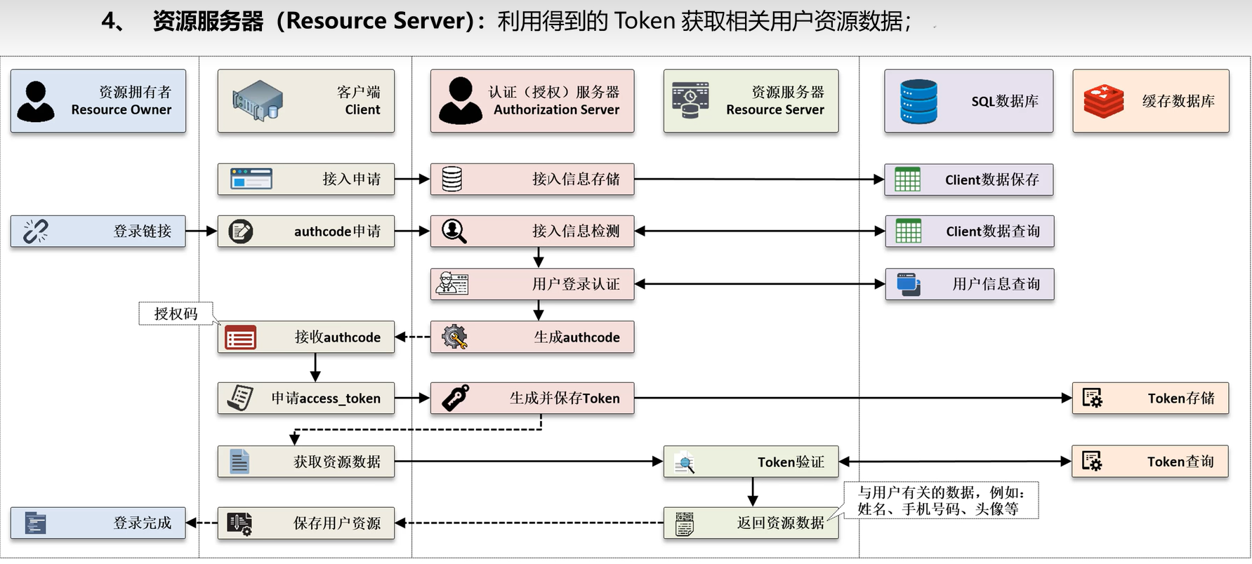 • 资源服务器(Resource Server)‌:存储用户资源并响应带有有效令牌的请求。