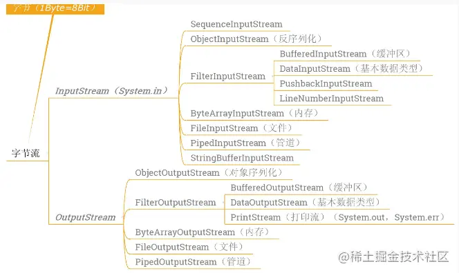 按照类型和输入输出方向可分为:输入字节流:InputStream,输出字节流:OutputStream,输入字符流:Reader,输出字符流:Writer。