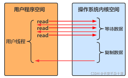 - 用户线程 在一个循环中一直调用read方法 ,若内核空间中还没有数据可读,立即返回