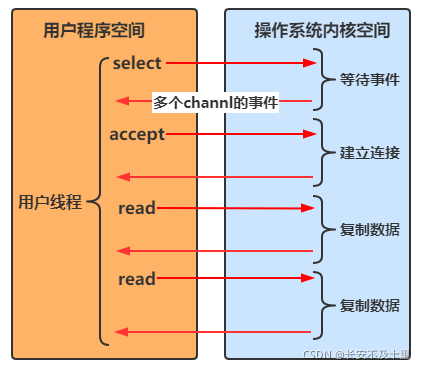 - 若事件未就绪,调用 selector 的 select() 方法会阻塞线程,直到 channel 发生了就绪事件。这些事件就绪后,select 方法就会返回这些事件交给 thread 来处理