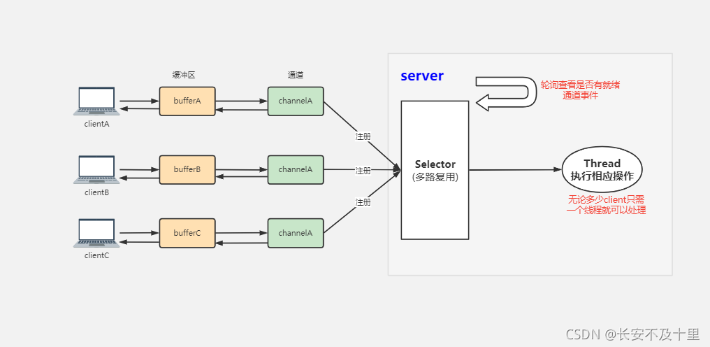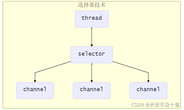 - selector 的作用就是配合一个线程来管理多个 channel(fileChannel因为是阻塞式的,所以无法使用selector),获取这些 channel 上发生的事件,这些 channel 工作在非阻塞模式下,当一个channel中没有执行任务时,可以去执行其他channel中的任务。适合连接数多,但流量较少的场景